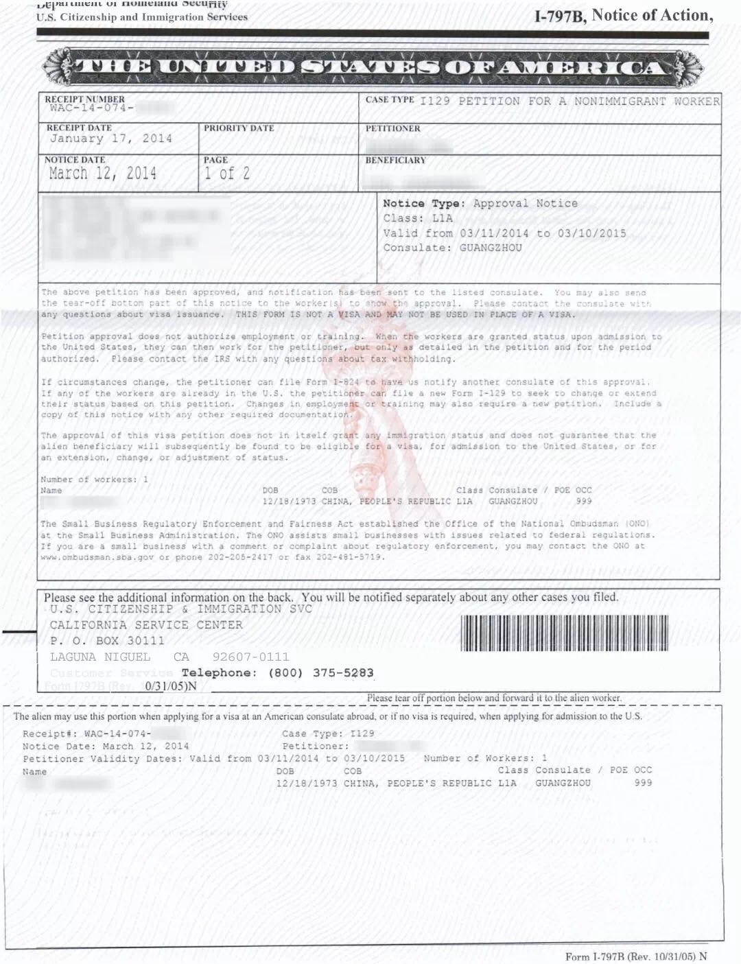 W先生首次申請的L1簽證有效期為一年,所以在1年后,W先生繼續委托鷹飛國際辦理L1簽證延期,順利批復3年。